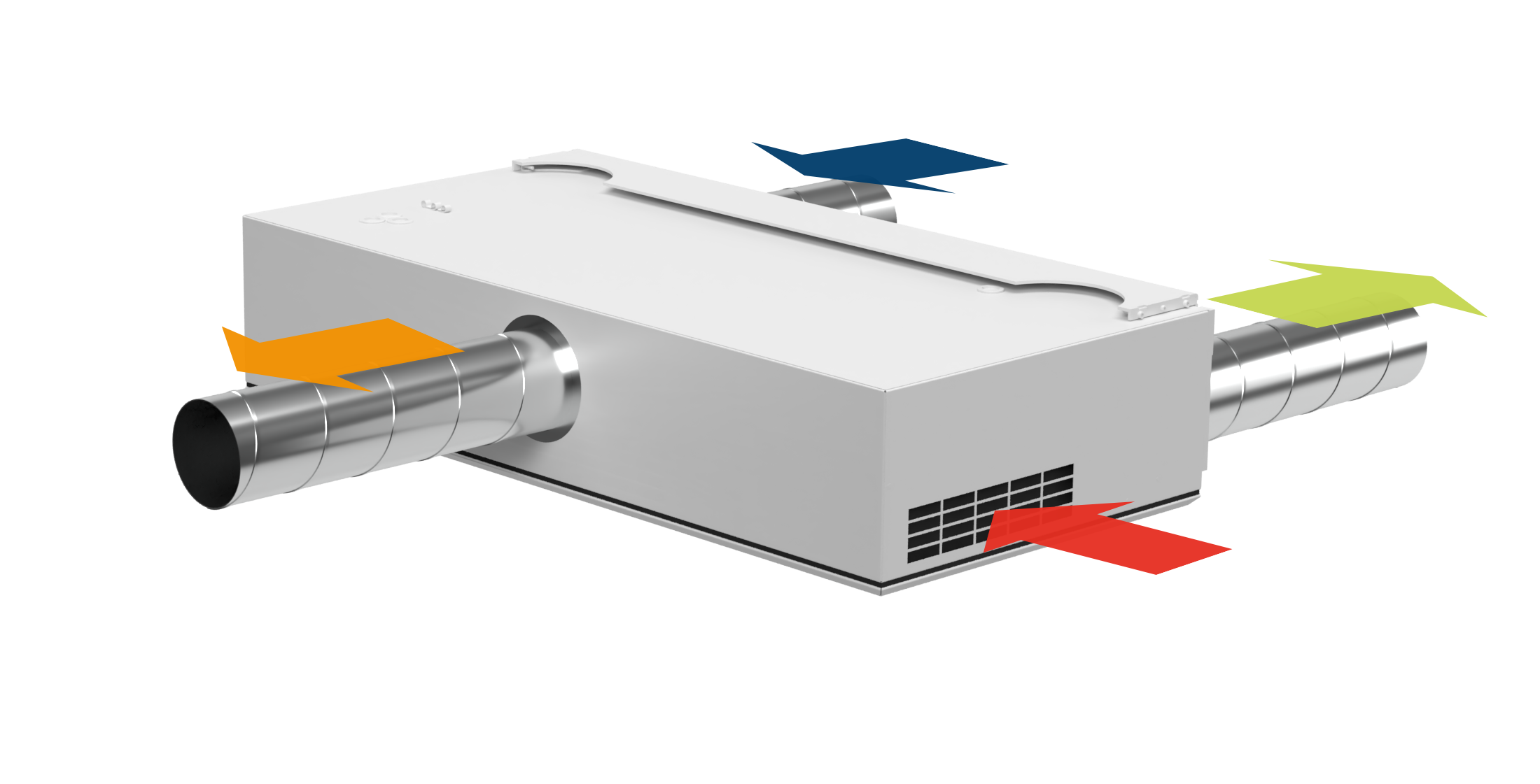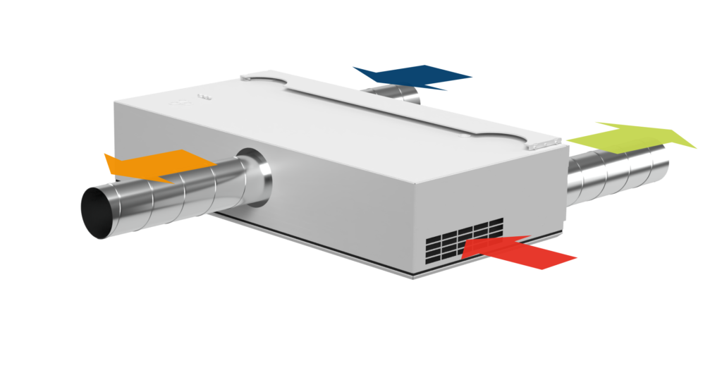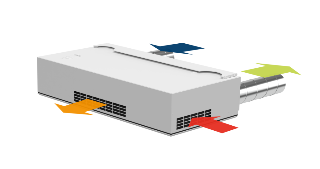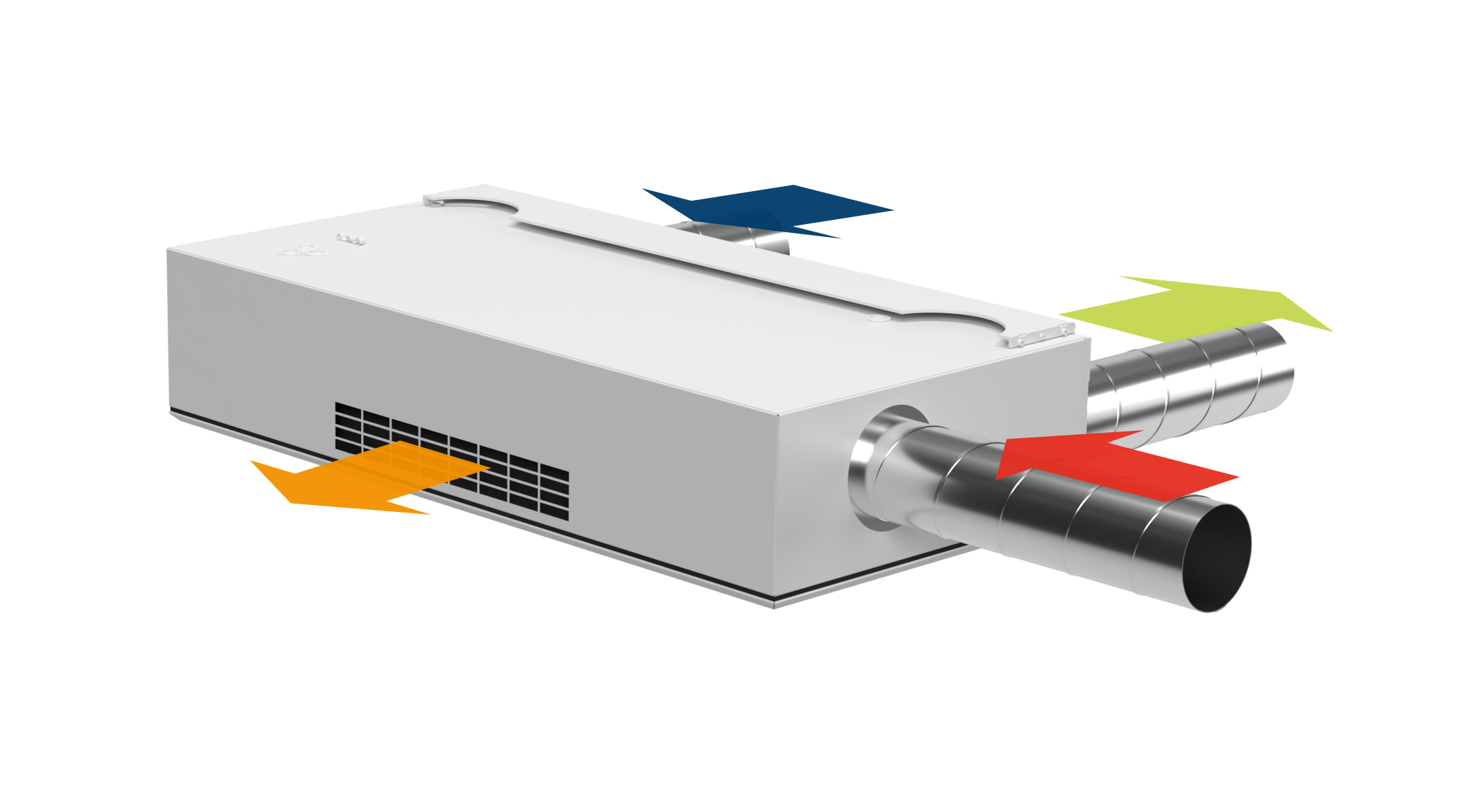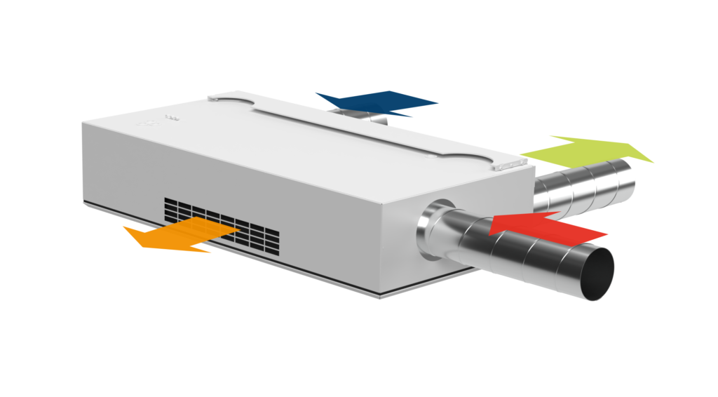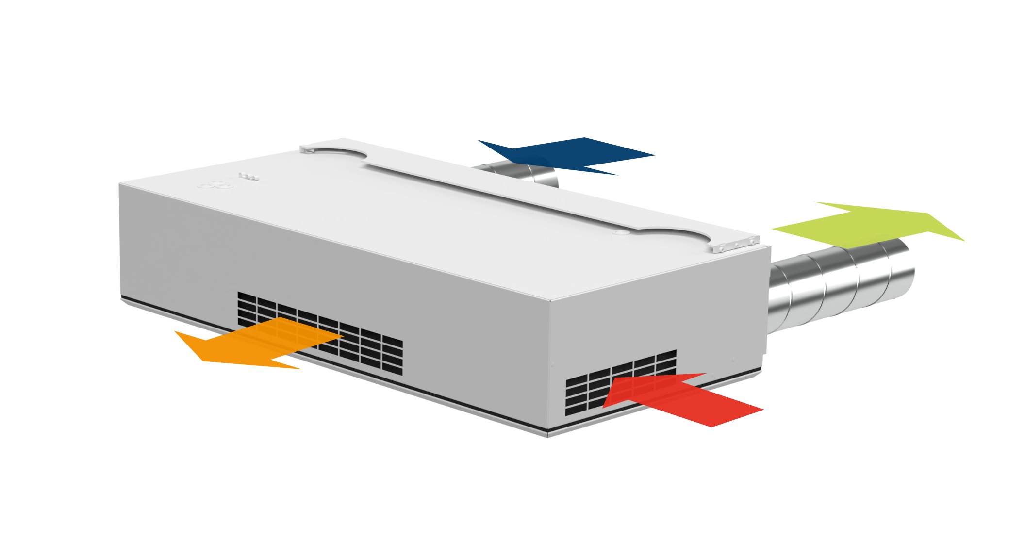 AM 150 — on horisontaalne seinapealne/lage paigaldatav seade, mille õhu sissepuhke ja väljatõmbe avad asuvad seadme taga.